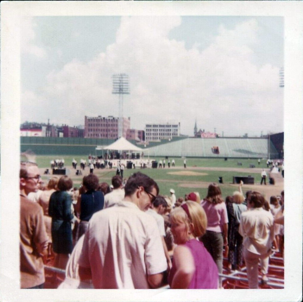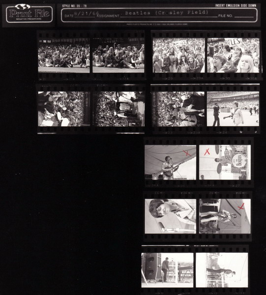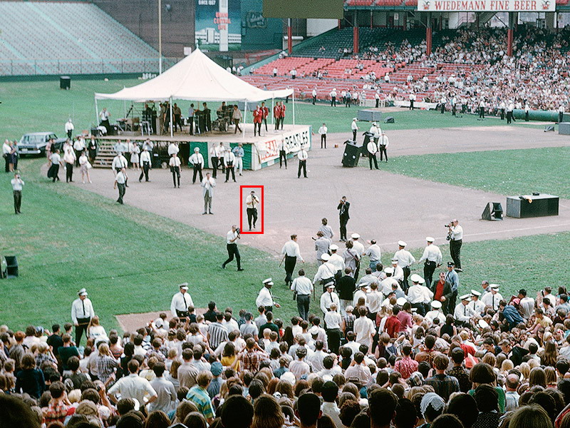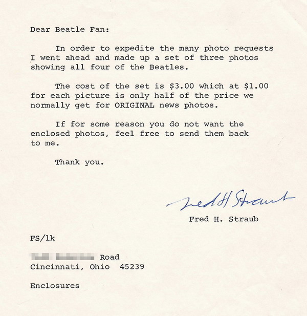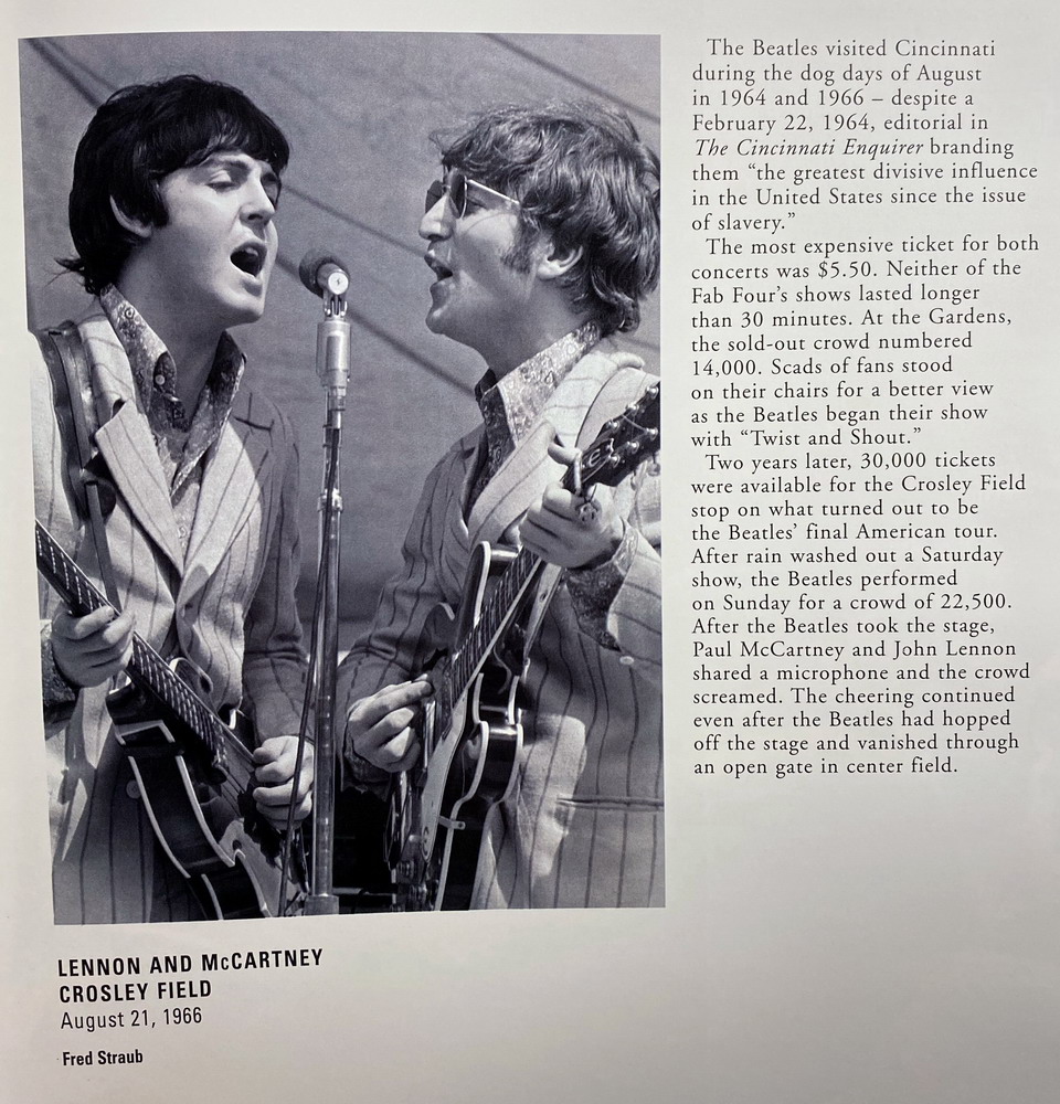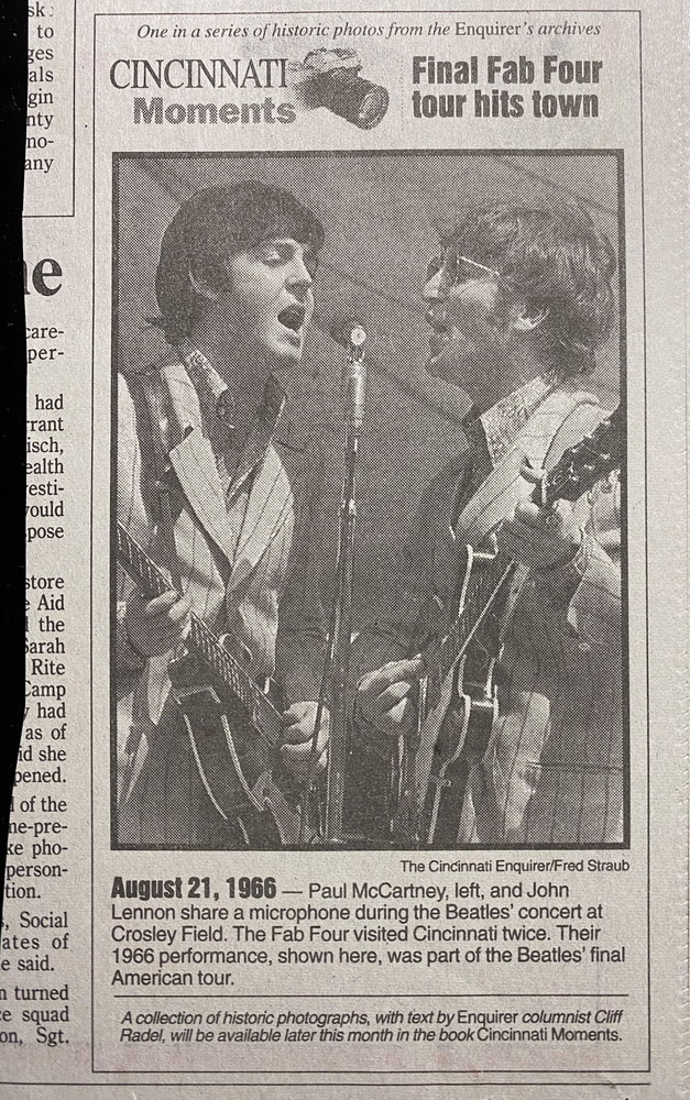 i lived my first 20 years in cincinnati. my dad, fred straub, worked at the 'cincinnati enquirer' as long as i could remember. he eventually aspired to 'chief photographer', until his retirement in 1995. as such, he had access to virtually any news worthy activity in the tri-state area. he travelled with the cincinnati reds to spring training and knew 'the big red machine' personally. we couldn't walk anywhere downtown without someone saying "hey, fred!". i wasn't a rabid music fan until the beatles. i got swept up in the beatlemania like so many others at that time. i was 12 in '66 and across the street was my 10 year old girlfriend. we couldn't get enough of the beatles. my dad, however, wasn't all that impressed with them, but when they returned to cincy in 1966, dad took covering the concert and decided to let me and her tag along. sadly for her, her mother said, "absolutely not!". maybe is was the 'long hair', but i suspect it had more to do with lennon's fairly recent 'jesus' mess. to this day, my once was girl friend has a strong resentment for her mom's choice. we got to crosley and hung out in the third base dugout. being as the stage was out in the field on 2nd base, there was no 'backstage'. some guy came by and said, "fred, you going to the press conference?", to which he replied, "no". you can imagine how bummed i was. he realized later that was a mistake. other groups came on stage and dad went out to cover them, while i waited in the dugout for the fabs. when the time came, we walked out onto field and to the stage. the noise was tremendous. so much screaming for the duration of the 25 minute show. luckily, i was close enough to actually hear their voices directly. i nodded/waved to them and they responded with a smile/nod. pretty cool, yet wildly surreal. i did record the show on a small cassette recorder, which were fairly new at the time, but it was haphazard and sounded like crap. i have no idea what happened to the cassette, as i never saw it again after awhile. dad probably recorded jazz over it. dad was busy snapping shots and eventually, the show was over and the beatles literally ran off to st. louis. we went to the enquirer to develop the film and make prints. his photos were instantly in high demand. he offered a set of three 8x10 black and white photos, depicting the four fabs. i now have all the negatives. |